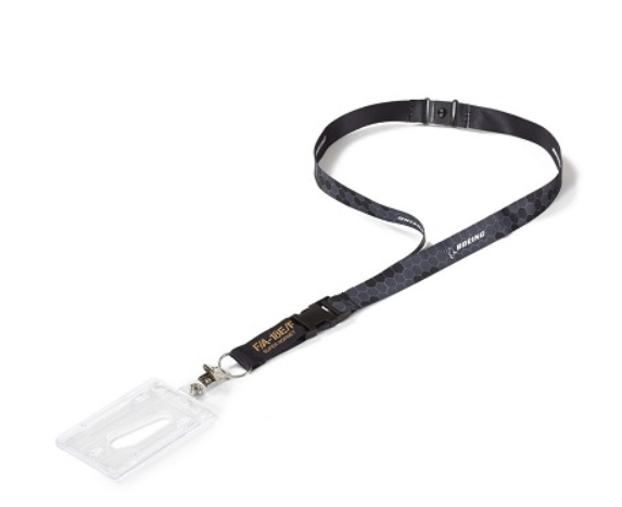 Give your badge an upgrade with this contemporary-look lanyard. Made from 100% polyester, it features our exclusive heat-transfer graphic design saluting your favorite Boeing product. The detachable buckle includes an O-ring and ID card holder with a safety breakaway feature and can also hold a camera, keys, or other items. Measures approximately 0.8"W x 33" around + 2.35" extension. Imported.