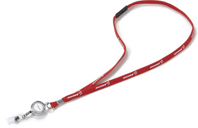 This sturdy lanyard displays the Boeing signature in white on a navy blue necklace,