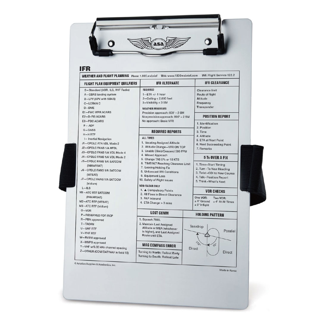 - Includes leg strap with pencil holder, strong metal clip, and useful IFR information tooled onto the attractive, brushed aluminum board.