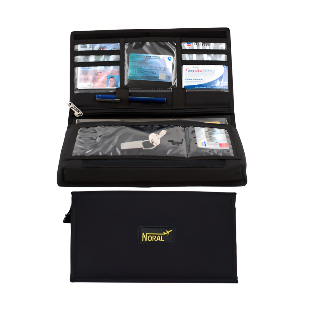 On the top flap you will find a zippered compartment for aircraft documents or checklists and a pen or pencil holder. Inside it also has six clear plastic pockets to store your business cards, credit cards, phone cards etc. and on the other flap it has a larger plastic pocket for your pilot license and medical certificate that you must carry. It folds closed with a strong Velcro system.